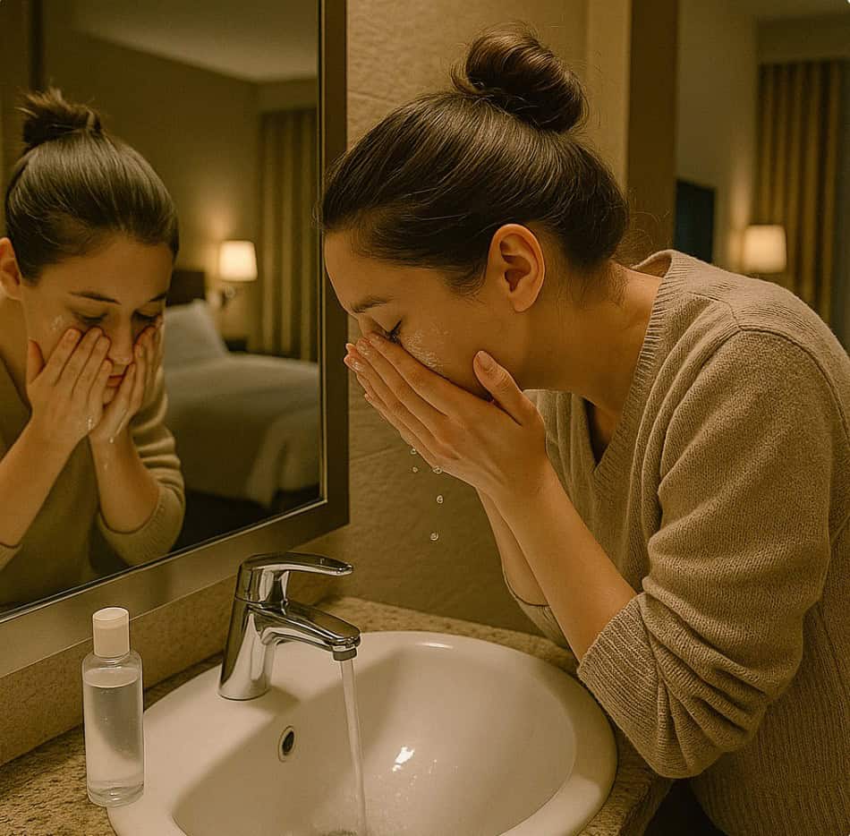 💡 Tip: Stick dengan skincare yang biasa anda guna. Sediakan travel kit siap-siap sebelum terbang.