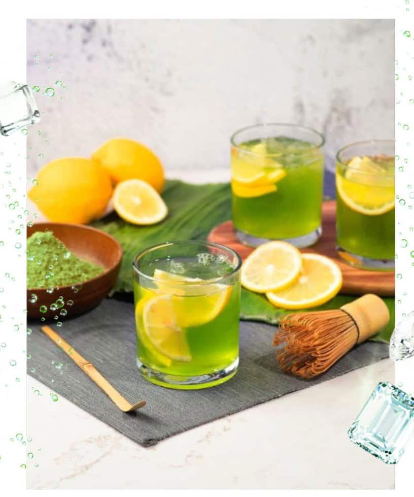 Teh Hijau Lemon adalah minuman yang menyegarkan dan kaya dengan antioksidan. Panaskan air Spritzer Sparkling, masukkan gula dan kacau rata. Setelah sejuk, masukkan serbuk teh hijau matcha dan kacau sehingga larut. Perah ¼ biji lemon ke dalam gelas, masukkan ketulan ais, dan tuangkan pati teh hijau. Isikan air berkarbonat sehingga gelas penuh dan hiaskan dengan hirisan lemon.